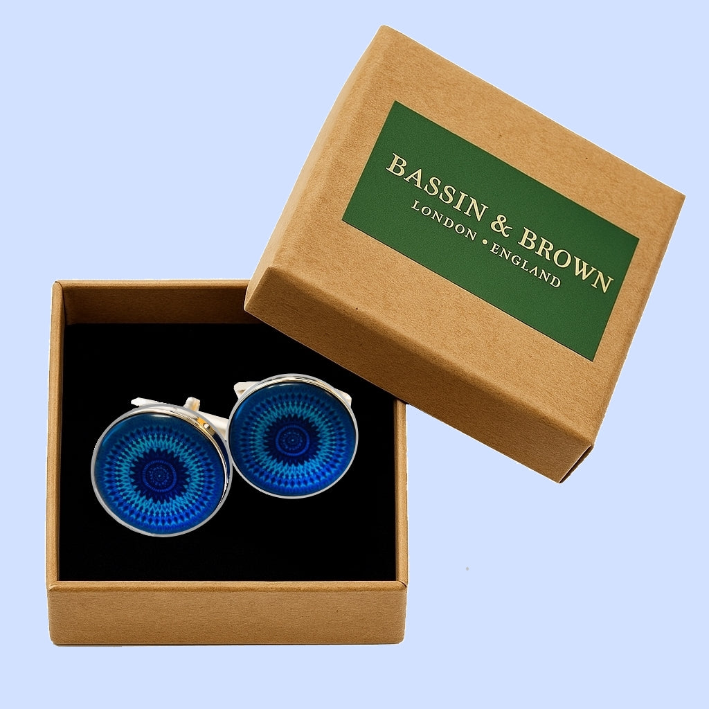These stylish Bassin and Brown Concentric Circles cufflinks make an ideal gift for admirers of mandala-inspired geometric design. This cobalt and royal blue pair features intricate mandala detailing, set within a 16mm round glass cabochon and finished in polished silver rhodium plate. Elegantly boxed in Bassin and Brown’s recyclable buff-toned kraft packaging, these kaleidoscopic cufflinks offer a swivel-back design for easy fastening to a double cuff shirt. Emblematic and subtly mystical, they make a thoughtful gift for someone close on a special occasion. Bassin and Brown offer worldwide delivery and aim to dispatch all orders within 24 hours of receipt (business days). A Next Day delivery service is available via Royal Mail (UK only – extra charge) - delivery before 1pm.