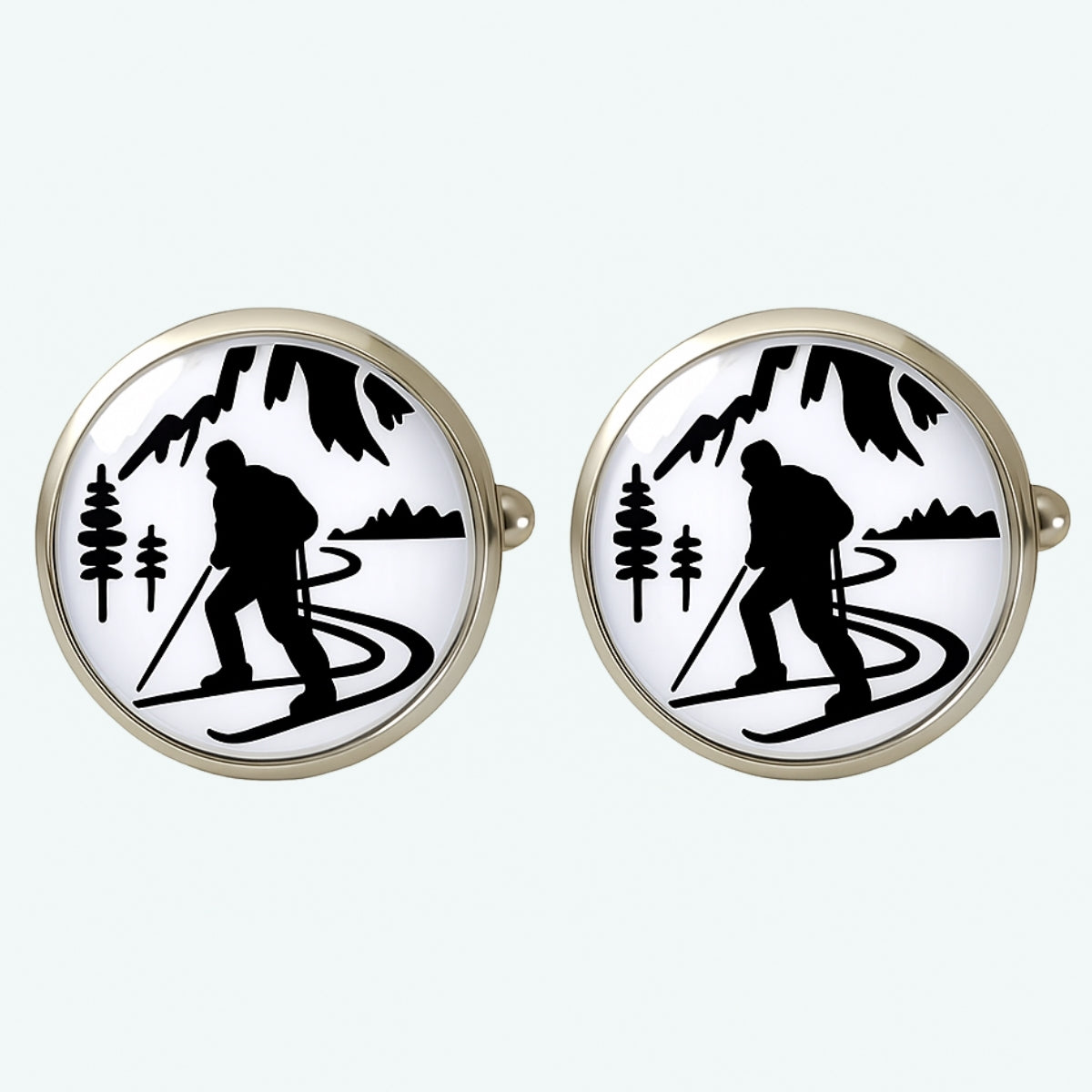 These Bassin and Brown Skier Cufflinks capture the thrill of alpine adventure in a striking silhouetted black and white image, featuring a mysterious skier carving through a winding mountain trail — a design reminiscent of an iconic ski sequence from a James Bond film.