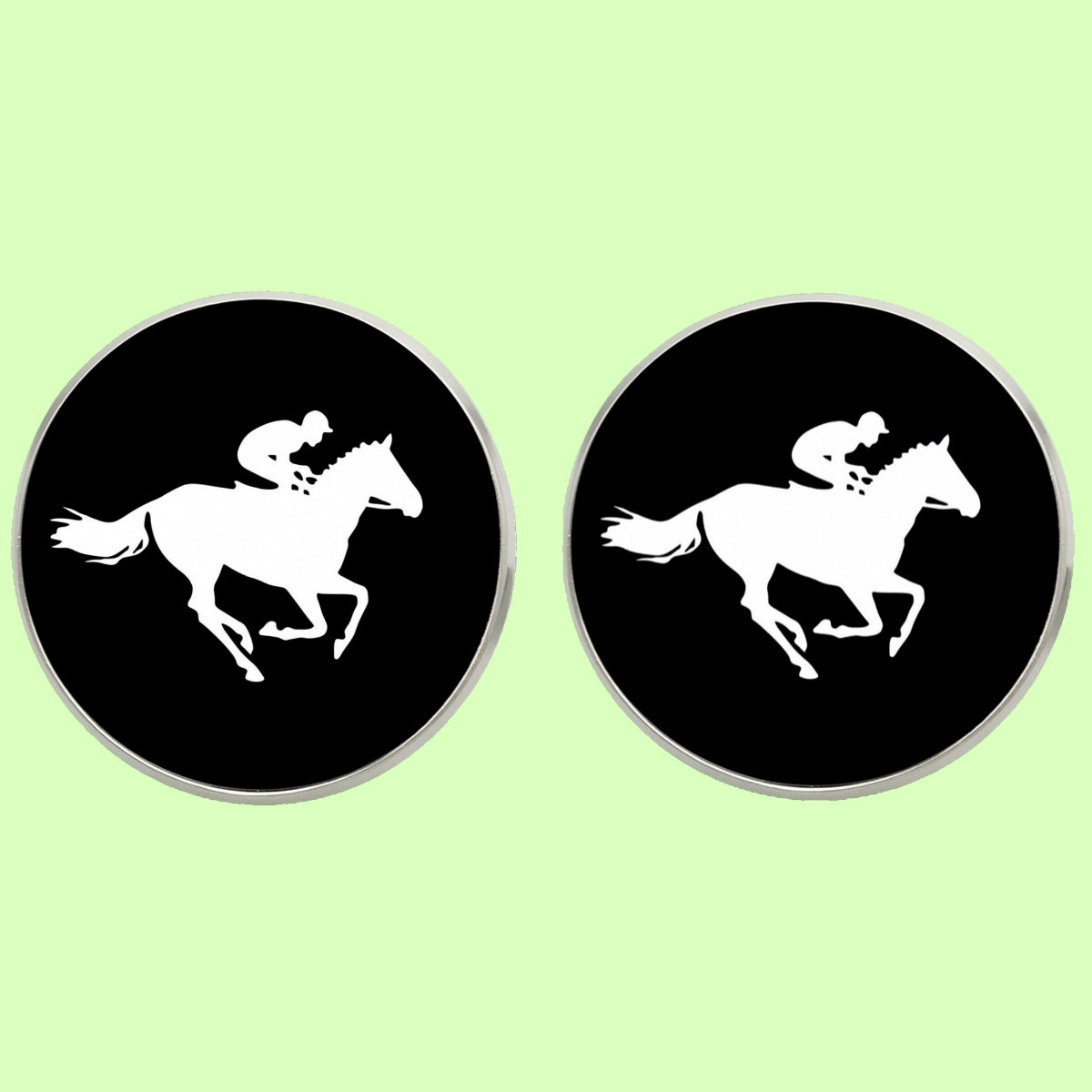 These black and white silhouette Bassin and Brown Horse Racing Cufflinks make the perfect gift for horse racing enthusiasts who have a passion for “The Sport of Kings. The cufflink design is finely detailed beneath a round, hardened glass cabochon—16mm in diameter—set within a polished silver rhodium-plated fitting. These stunning silhouette cufflinks are elegantly presented in a Bassin and Brown buff-coloured, recyclable kraft gift box and feature a convenient swivel-back design for easy attachment and removal from a double cuff shirt. A wonderful gift for those who appreciate horse racing and the joy of spotting a winner. Bassin and Brown deliver worldwide and aim to send out all orders within 24 hours of receipt. Next Day delivery service available via Royal Mail (UK only – extra charge) delivery next day before 1pm (business days). Bassin and Brown for sporting cufflinks.