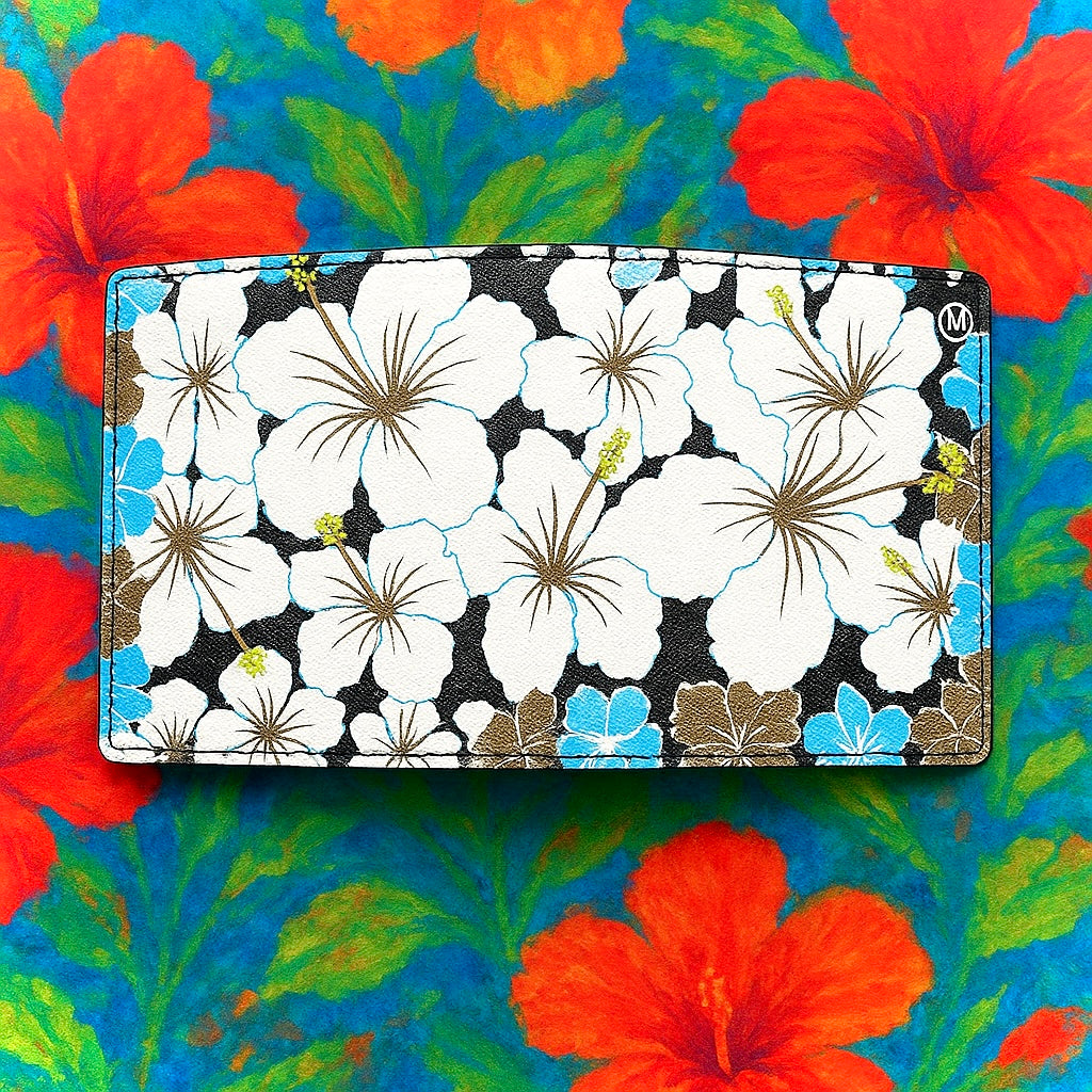 Bring tropical flair and everyday practicality together with this beautifully designed Bassin and Brown bi-fold wallet featuring a striking hibiscus floral pattern in shades of white, blue, khaki, and black. The vibrant design is inspired by lush tropical blooms, making it a standout accessory for any occasion.